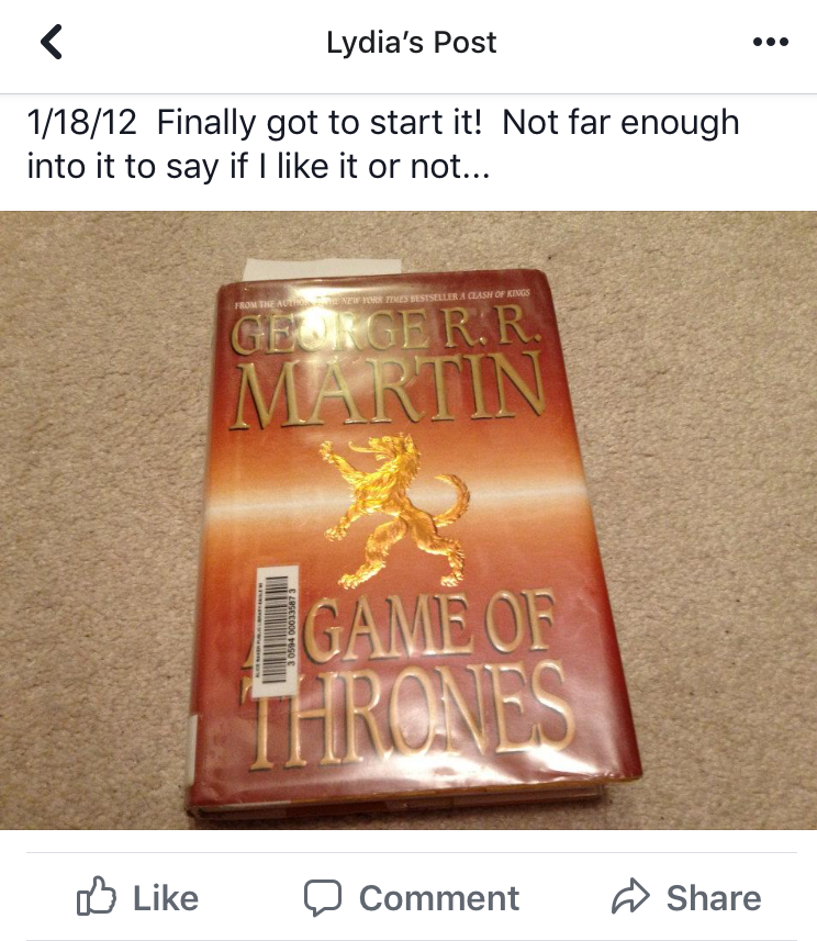 But 2012 was a different story, and enter my love of Jon, Arya, Tyrion, and my love-hate relationship with George RR Martin. People were talking about this series that was full of war and intrigue and dragons. Yes, dragons. I worked at the library at that time, and the waitlist for A Dance with Dragons was still crazy long. Any book that good was a book I had to read. Except that I had to read the four books before it because I cannot read a series out of order. I’m not positive God will strike me dead, but I don’t want to tempt him. So, I knew I had to read all 3,181 pages of the first four books before I could read the new book everyone was raving about. I could handle a couple of dragons and a couple thousand pages the way people were talking about these books.